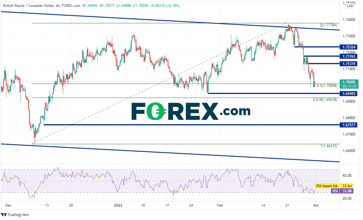 英镑/加元4小时图水平支撑位就在市价下方不远处的1月27日低点,即1.6950附近。如果下破,可能先后下看前述行情的61.8%回档位1.6923、水平支撑位1.6758、2021年12月8日低点1.6642。上方有一个阻力带,落在1.7132-1.7176之间,由两个水平阻力位和50天与200天均线构成。如果攻克,可能上看水平阻力位1.7232,以及通道式趋势线1.7340附近。
