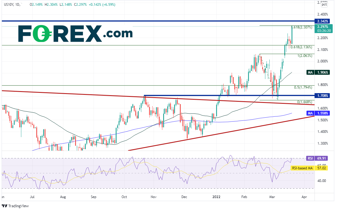 市场大为震惊,美债收益率飚升。10年期收益率大举站上2018年11月高点到2020年3月低点行情的61.8%回档位,即2.136%附近,此文发稿时更是摸至2019年5月以来最高点2.304%,其也是2月16日高点到3月7日低点行情的161.8%扩展位。阻力在略高的水平阻力位2.342%,支撑位在今天低点2.148%。