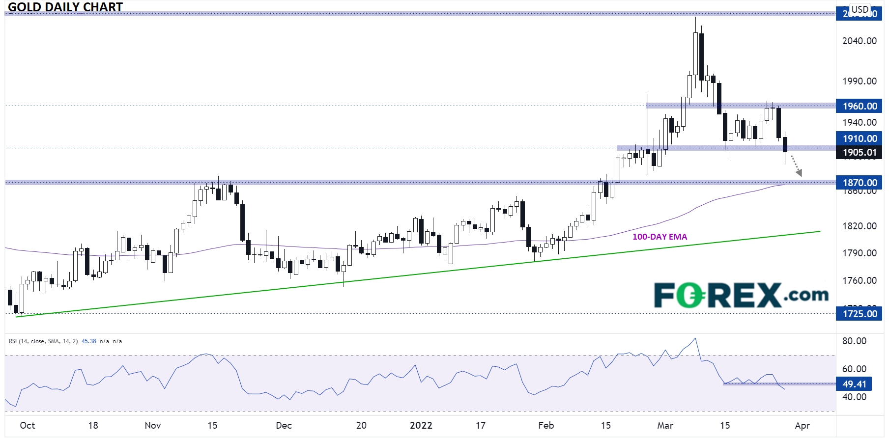 如果接下来几天失守1870,则可能延续跌势,下探上涨趋势线支撑位所在的1800一线下轨。与此同时,如果乌克兰境内的军事行动重新升级,可能重振黄金买需。但要转变短线趋势,天平向多头倾斜,则可能还需有效站上1960。