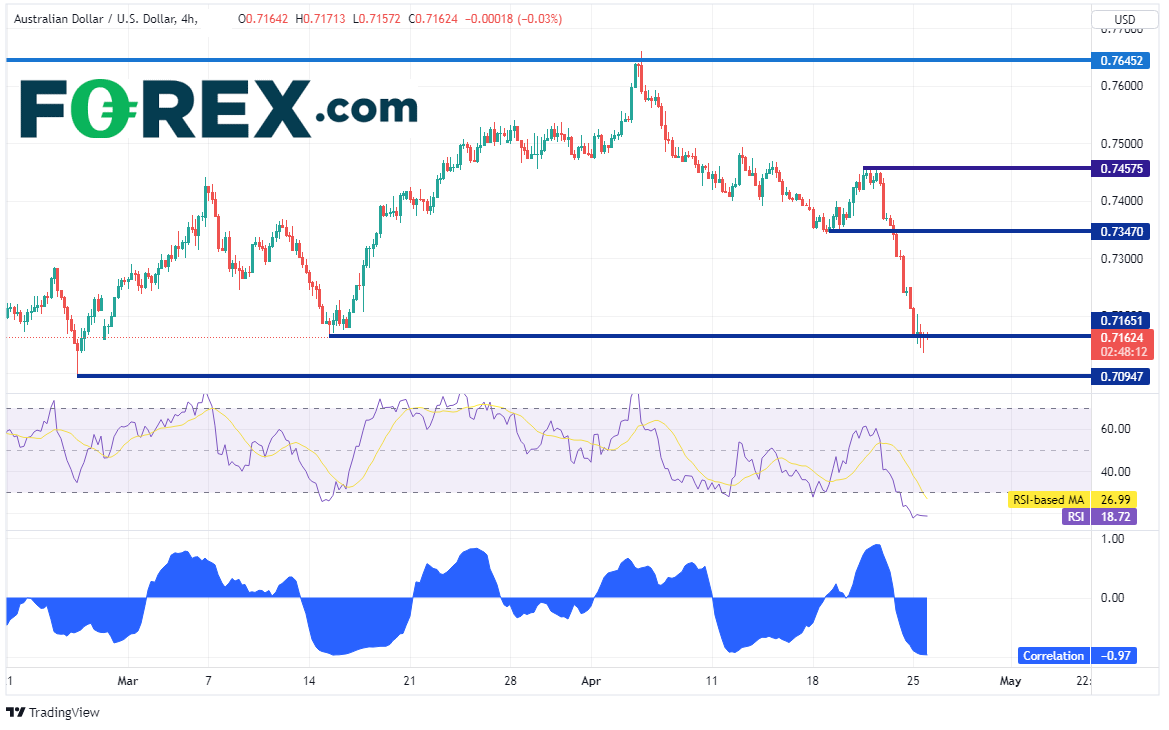 下面的4小时图底部显示,澳元/美元和美元/离岸人民币当前相关系数为-0.97。-1.00表明完全负相关,即其中一个货币对上涨,另一货币对随之下跌。而-0.97已非常接近于-1.00,如果美元/离岸人民币准备修正,则澳元/美元可能随之上涨。另请注意,RSI处于超卖区域,表明澳元/美元或准备回升。上方直至0.7347才迎来第一个阻力位,然后上看0.7458。下档支撑位在0.7095。