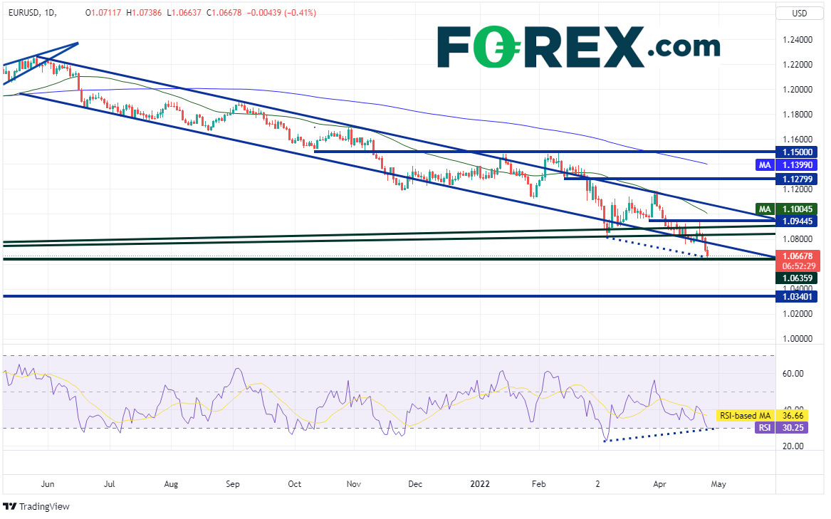 欧元/美元在美元指数中的权重超过57%,通常与美元指数反向波动。该货币对日图自2021年5月以来有序走低并形成下降通道,从当时的高点1.2263,到如今的低点1.0662。在美元指数挺近2020年3月高点之际,欧元/美元同样逼近2020年3月低点1.0636。如果失守,直至2017年1月低点1.0340才可能出现支撑。但价格与RSI正处于背离状态,表明欧元/美元短线或准备反弹。第一水平阻力位在4月19日低点1.0761,然后是4月21日形成的射日之星K线的底部1.0824。