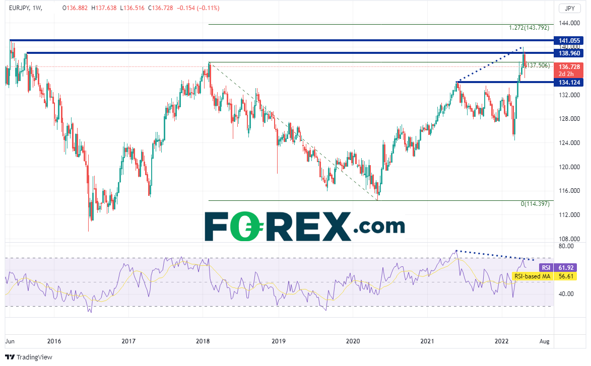 来看欧元/日元周图。该货币对2020年5月于114.40筑底,随后不断上扬。欧元/日元两周前创下2015年6月以来最高点140.00,途中攻克了2018年1月高点137.50。价格此后回到突破位并寻找新的方向。上方阻力在近期高点140.00,然后是2015年6月高点形成的水平阻力位141.05。但请注意,RSI目前与价格背离,表明价格或准备回撤。支撑位在上周低点134.77,然后是水平支撑位134.12。