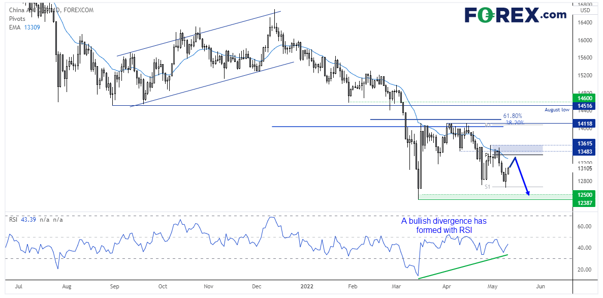 富时中国A50指数在周一下破13000后现在交投重回13000上方。市场仍处于清晰的下跌趋势当中,如之前报告提到的,我们仍倾向认为市场将再次测试并可能下破12500。然而,有迹象显示,股指可能会就主导跌势进行回撤。