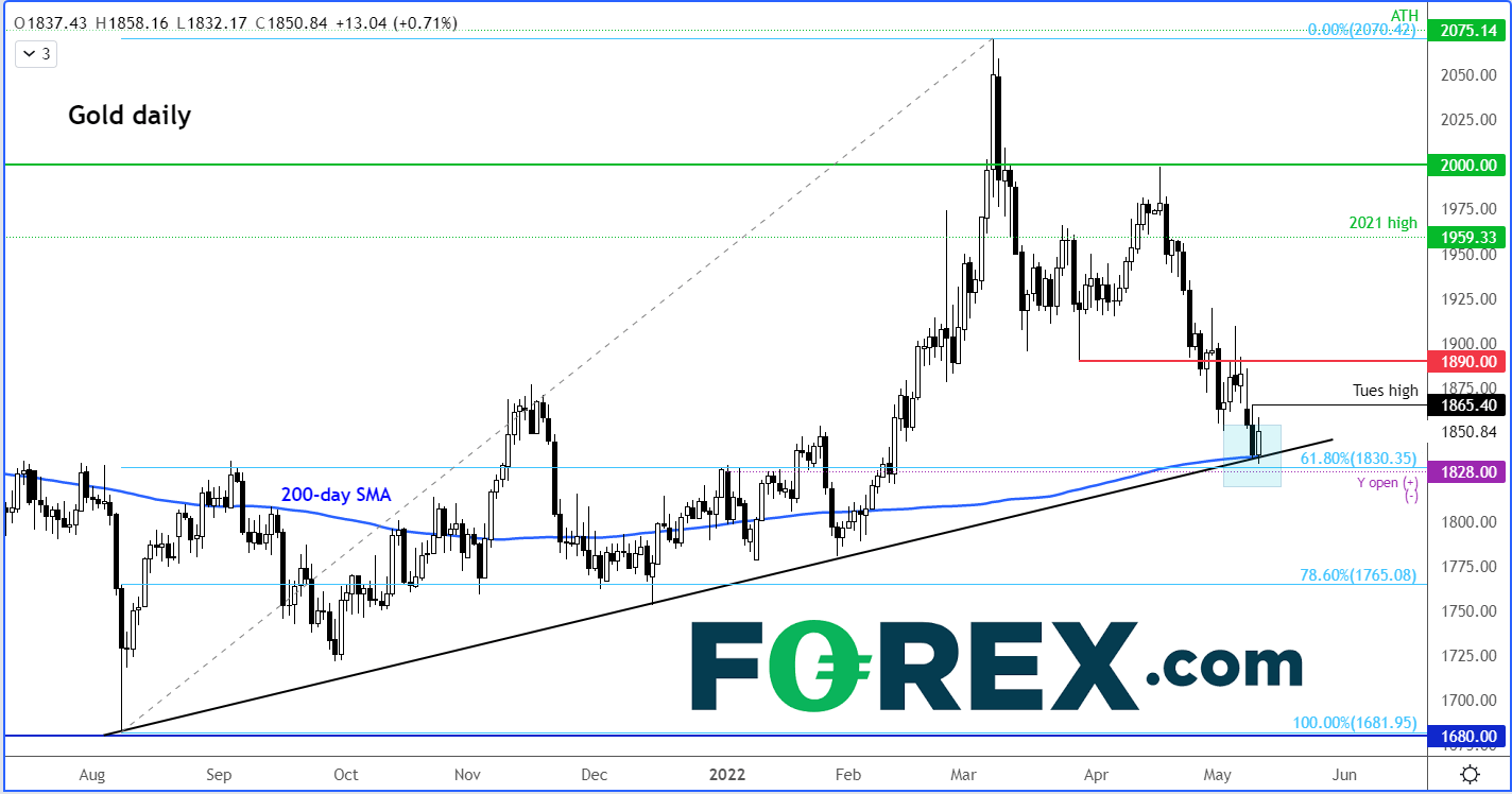 但低于1850已经相当“便宜”,吸引力又变大了。考虑到在通胀率上升与股市震荡起伏的环境中,某些交易产品暴跌、法币购买力下降,黄金的低价优势尤其明显。