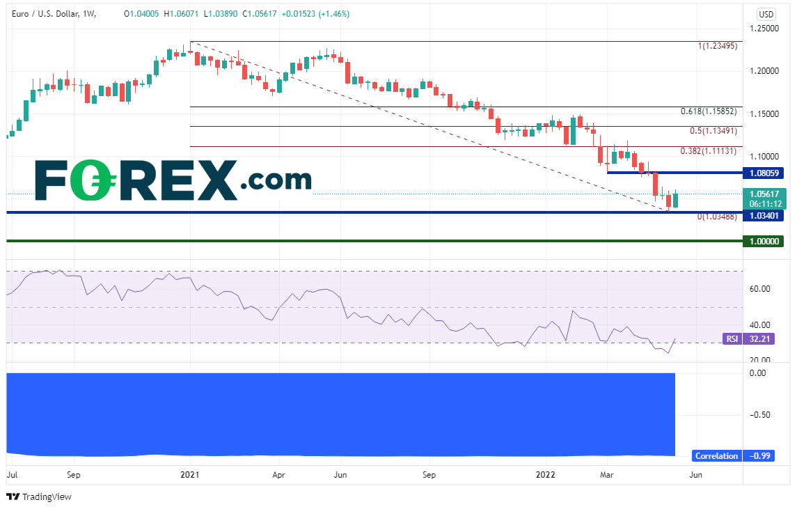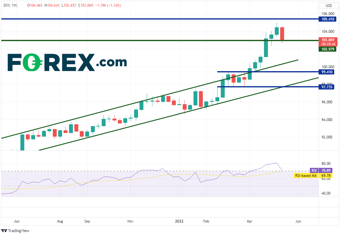 美元指数似乎给出了肯定的答案。一般而言,股指与美元反向波动。即,当股市下跌,美元倾向于上涨。但在周三标普500指数和纳斯达克100指数跌逾4%时,美元指数仅斩获0.5%的涨幅。是因为美元交易者担心经济增长放慢与滞胀吗?到了周四,股市再度收低时美元指数继续下跌,跌幅1%,且回到疫情期间高点102.98下方,周图似将走出6周中第一根阴线。