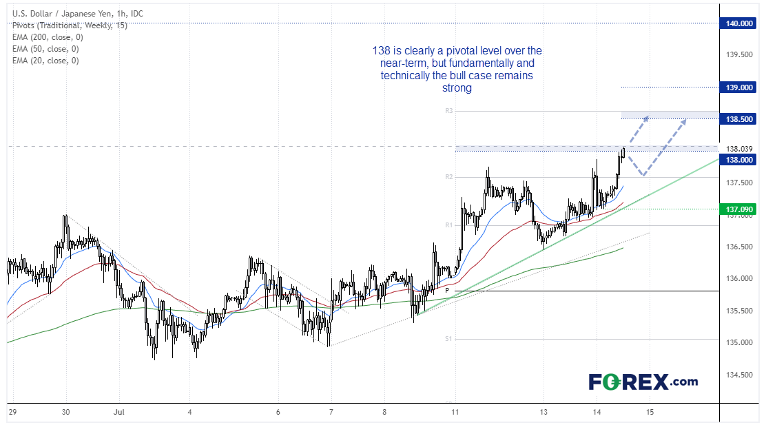 基于上述基本面以及技术面的强劲上涨趋势,美元/日元实现摸至140的可能性似乎较高。所以,即使价格确实自138回落,多头的兴趣可能依然不减,期间目标或位于138.50。