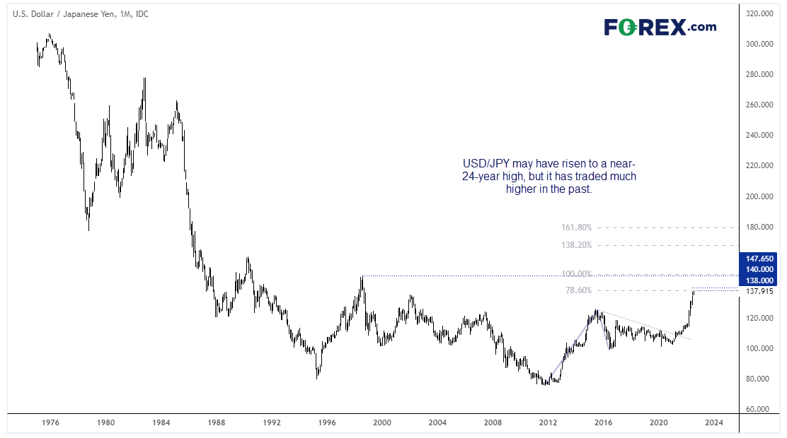 因此,美元/日元今天自1998年9月以来首次摸至138,这个价位相对近代历史属于相当高的水平。但如果我们后退一步把视线放长,可以看到以前价格涨得更高(事实上高度是现在的两倍)。为了说明这轮反弹走了有多远,以及价格上次到达此位时世界的样子,我们挑选了1998年9月以来的一些史实,不是为了在市场上交易,而是为新入场的和未亲历的投资者补充背景知识和记忆。