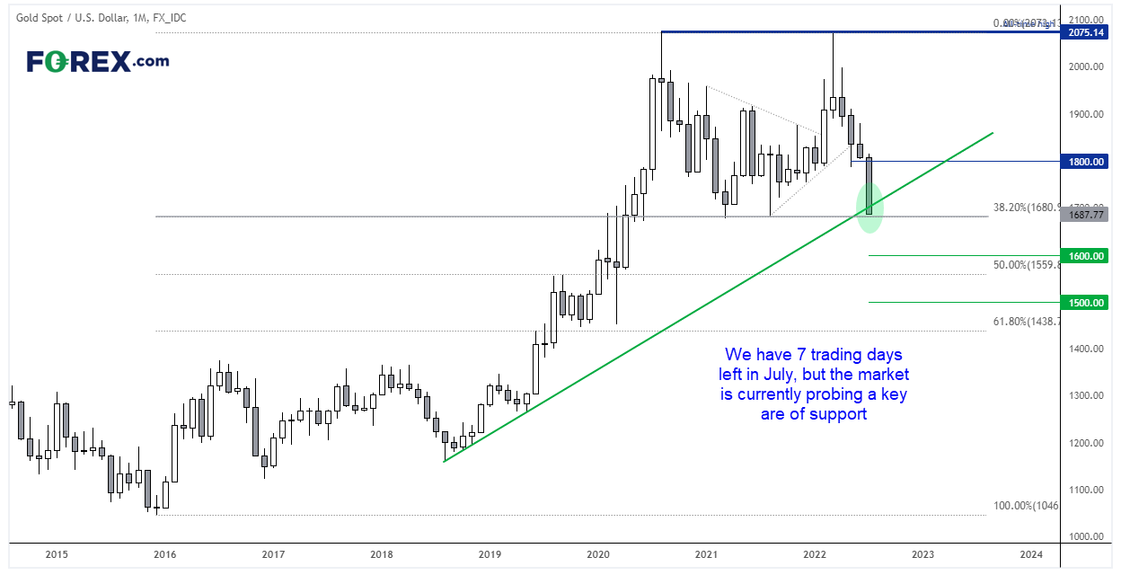 月图就交易于2018年趋势线下方,略高于疫情爆发的2021年的低点,也在2016年低点到2022年高点行情的38.2%回档位。所以,7月收盘价可能左右8月情绪走向,造成令人惊艳的反弹或持续下跌两种不同的结果。