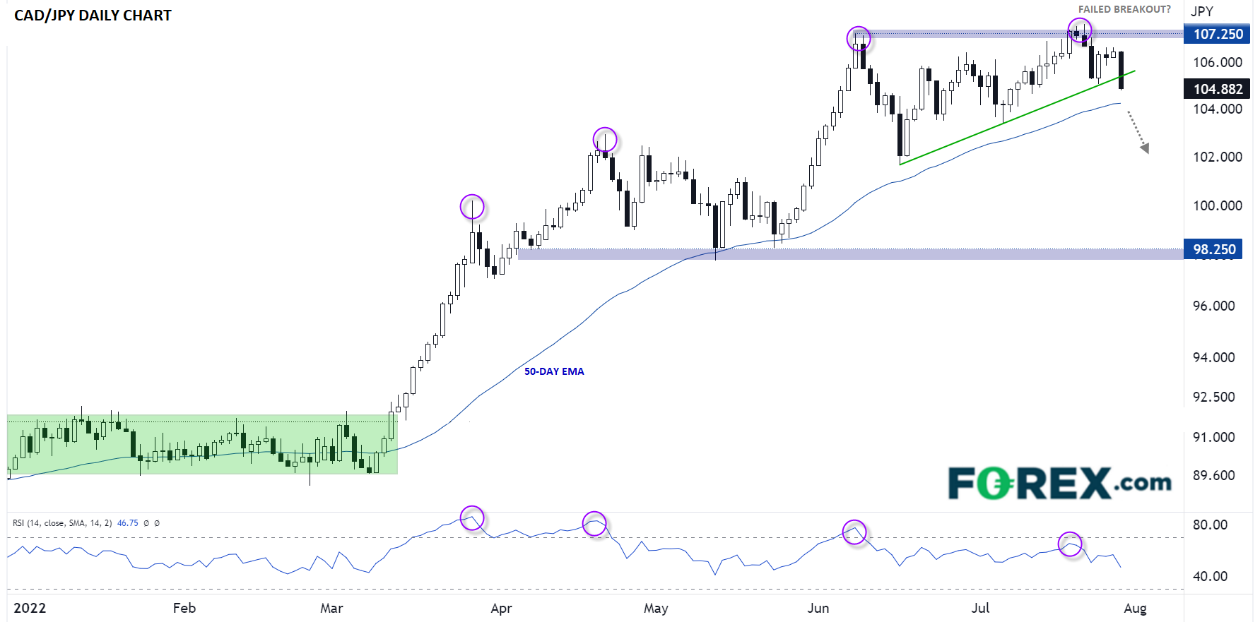 加元/日元RSI罕见四重看跌背离,关注上涨趋势线与均线的得失 - 嘉盛官网
