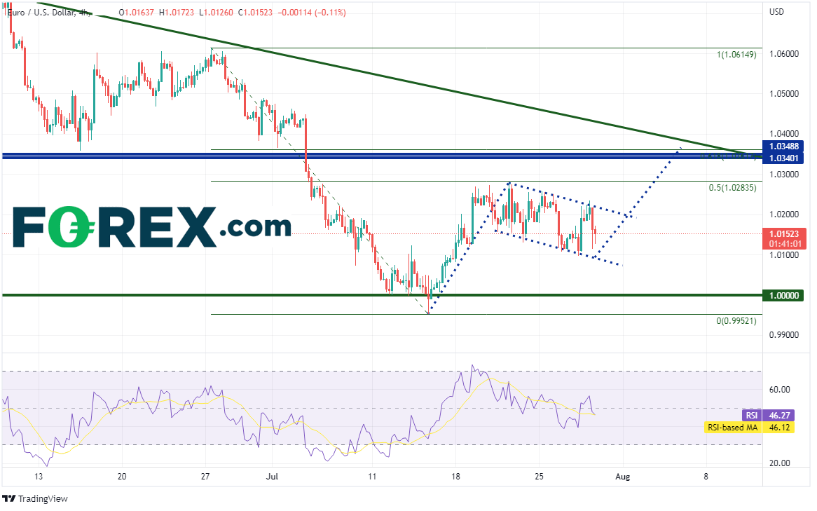 美元从昨天FOMC会议之后开始下跌。当时FOMC指出,“支出与产出指标近期走弱”,美联储未来将在每次会议召开时具体问题具体分析。今天的GDP数据发布后,美元再度开始下行。市场正在衡量定于8月发布的7月经济数据变弱的可能性。FOMC下次会议要到9月才会召开。交易者因此关注今后加息步伐放慢的前景,从而引爆冒险情绪。