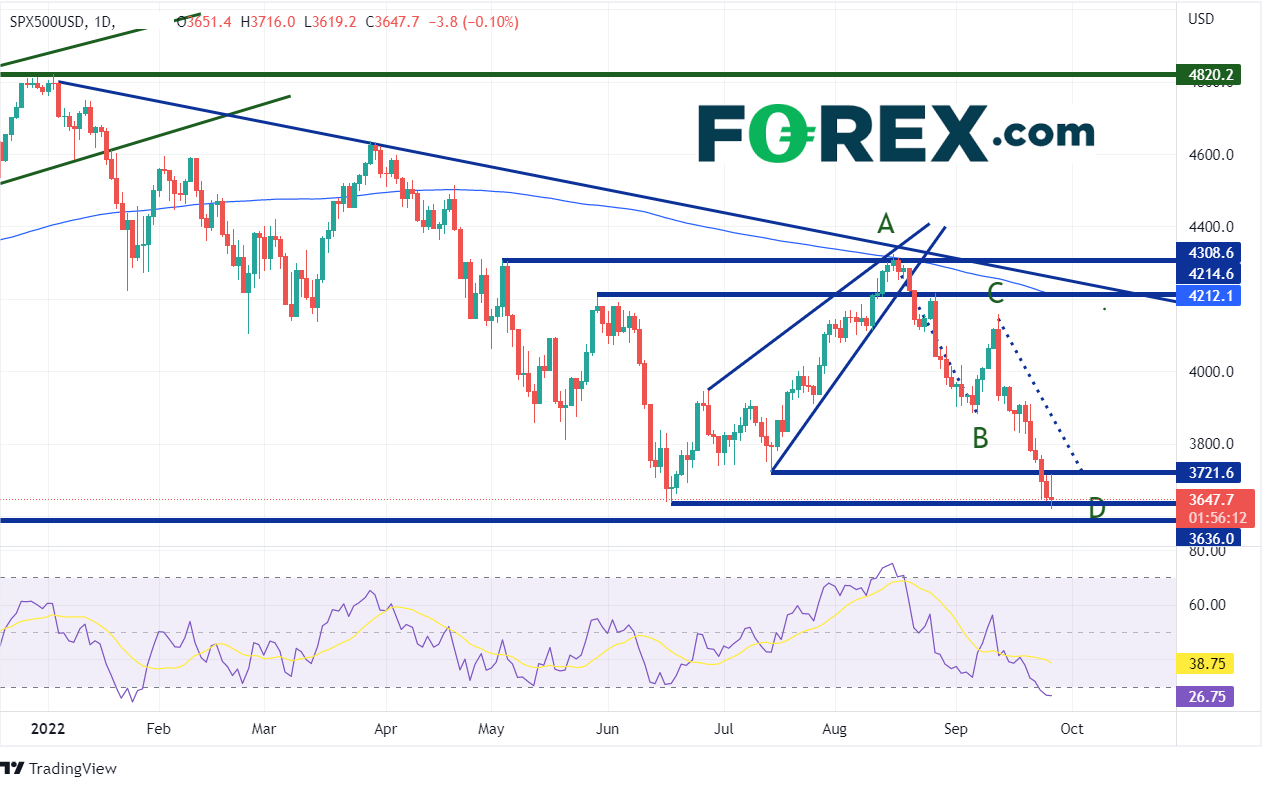 标普500指数在6月16日创下3638.8低点,之后回升并形成上升楔形形态,8月16日摸至水平阻力位兼200天均线4308.6附近。自那以后,这个大盘股指不断下跌,形成AB=CD形态,到达前行情的100%回档位。价格在周一继续下跌,并在周二于3620.2创下年内新低。