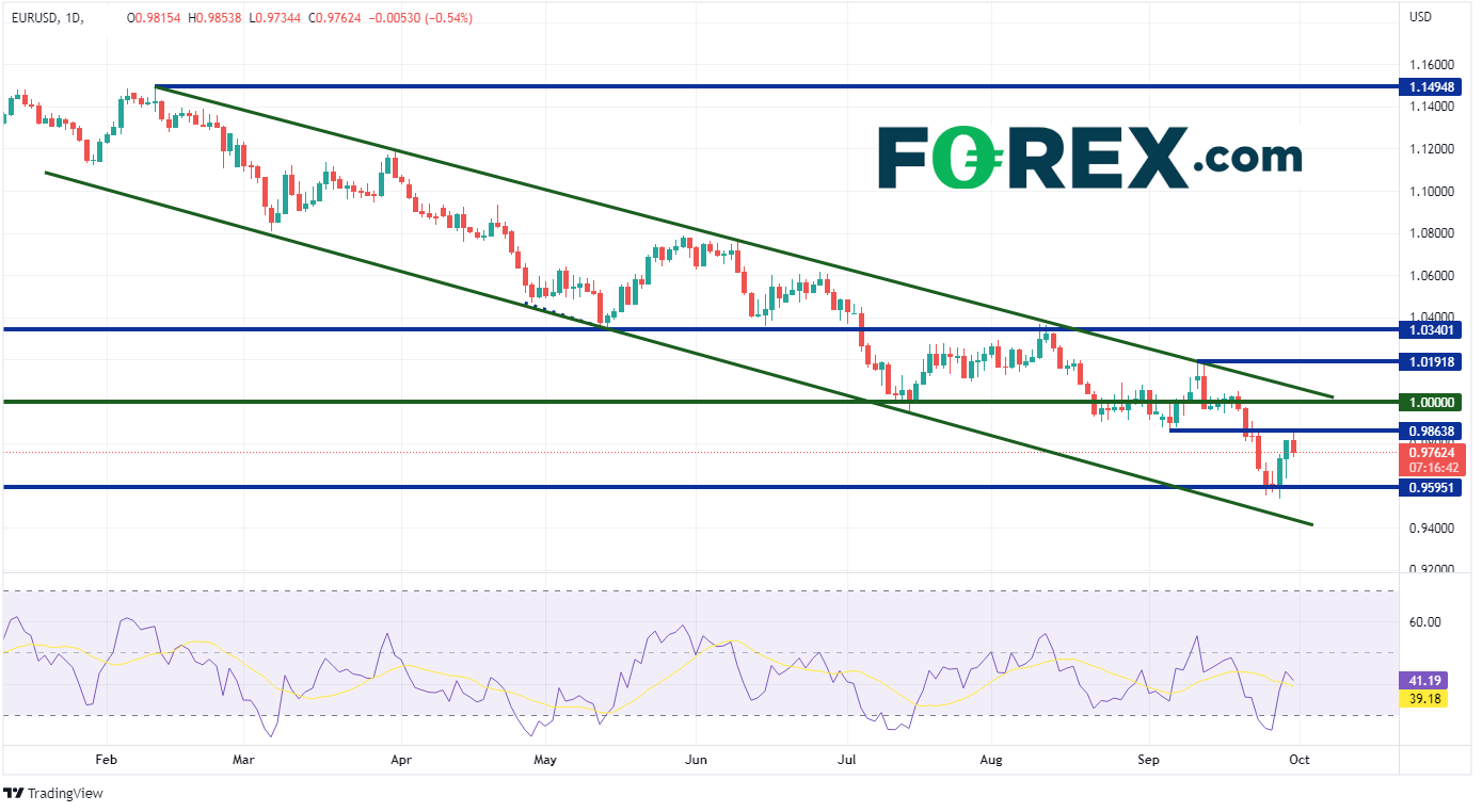 欧元/美元自2月涨至1.1500附近高点后不断下跌,形成下降通道。期间价格先于7月14日下破平价,后回升至1.0340/1.0350区域附近,在8月14日再度下破平价,此后围绕该位盘桓一月,直至9月21日最终下探通道下轨趋势线。该货币对周三最低跌至2002年6月以来最低点0.9536,最近回到了通道内,但周五于0.9864遭遇水平阻力位。