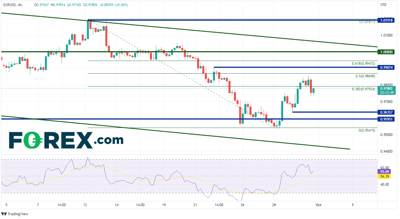 欧元/美元4小时图触及20年低点后回升并逼近9月12日高点到9月28日低点行情的50%回档位0.9870附近,如果攻克该位,可望先后摸至9月22日高点0.9907、前述行情的61.8%回档位0.9947附近。但如果价格继续下跌,可能先后下看昨天低点0.9636、9月22日低点0.9542。如果欧元/美元创下20年新低,则下个支撑位在通道下轨趋势线0.9340附近。