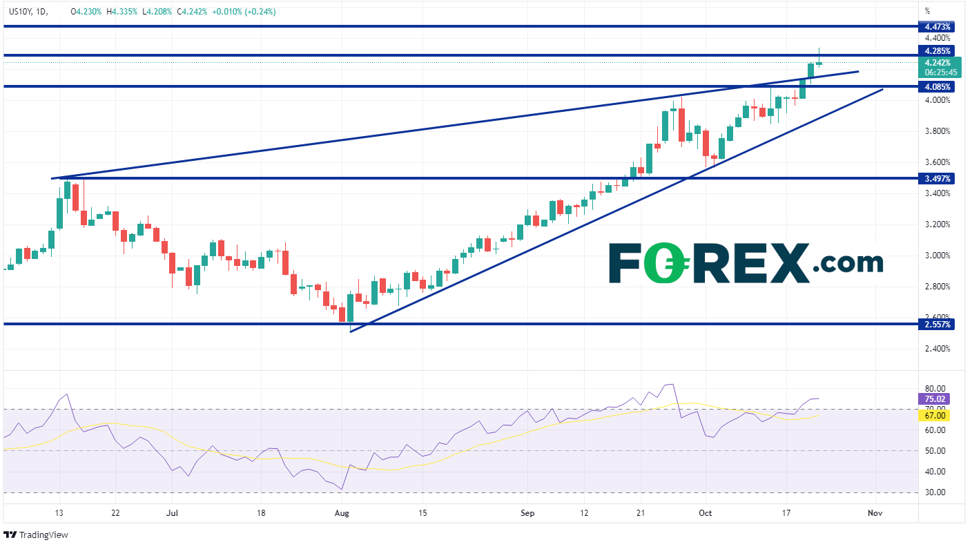 美债收益率走势相似。如果美联储开始放慢加息步伐,美债收益率将放缓走势。此前10年期美债收益率按上升楔形增长,不过预期收益率将跌破这一形态。周四收益率突破上轨是否会是一次假突破?《华尔街日报》发文后,10年期美债收益率走势变动与美元指数指数相似,在冲上新高后快速反转。如果日内保持倒锤形态,国债收益率将回归楔形,测试上升楔形下轨,逼近3.85%。同时值得注意的是,RSI表现与国债收益率相反,表明将出现盘整。