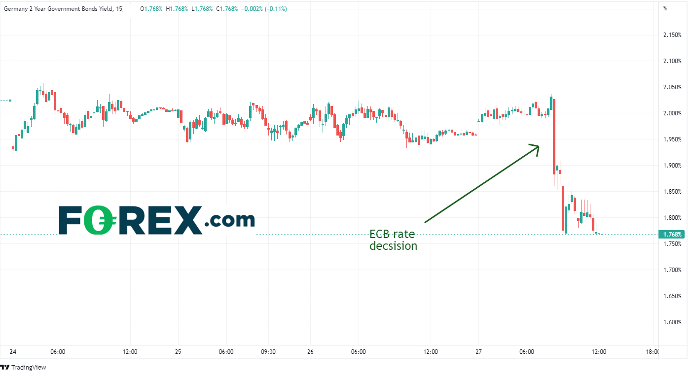当天受欧洲央行会议和随后的新闻发布会影响最大的是2年期德国国债收益率,从当天2.036%的高位下跌近10%至1.768%。