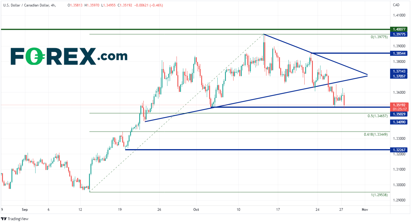 如果美元/加元继续走低,跌穿1.3502,第一支撑位将落在1.3466,即9月12日低点至10月13日高点的50%回档位。继续向下,第二支撑位位于61.8%回档位,第三支撑位落在9月22日低点1.3227。如果美元/加元守住关口实现反弹,则第一阻力位位于对称三角形下轨靠近1.3670,第二阻力位则在三角形上轨1.3780附近。如果货币对价格在此突破,则下一个阻力位将落在1.3855(10月21日高点)。