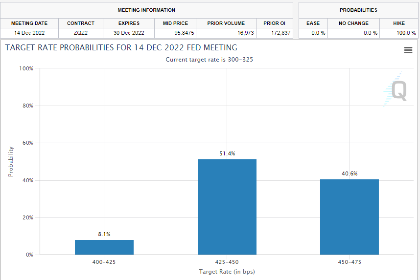 那么美联储会认为1.2%的数值算是“畸高”吗?同时,美联储最关注的通胀衡量指标PCE重回3月以来高点,应该会引起美联储重视。11月会议加息75个基点似乎已成事实,市场现在将视线转向12月会议,届时美联储是否会转向,放缓加息步伐?如果新经济数据出炉,是否会提高市场的利率目标预期?