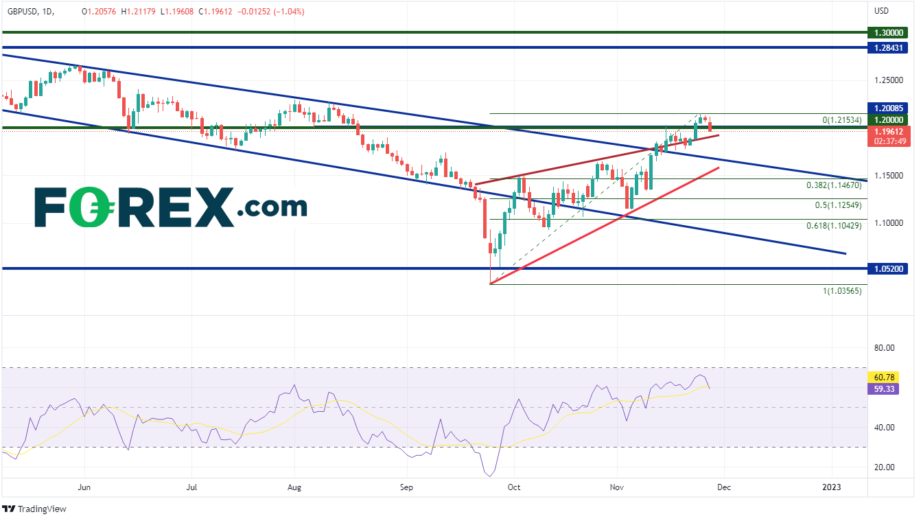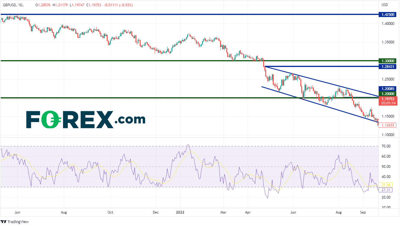 就在两个月前,英镑/美元交投于于历史最低位,触及低点1.03565。如今,该货币对竟然已经交投于1.1950附近!过去2个月发生了很多事情,使该货币对从崩溃的边缘回到到如今的点位。许多人将抛售归因于利兹·特拉斯,或者至少归因于她的“迷你预算”,因为这将在预算赤字中留下一个巨大的漏洞。尽管这可能是压垮骆驼的最后一根稻草,但在9月底的抛售之前,英镑/美元已经走低了几个月。英镑/美元在2月22日创下年初至今的高点1.4250!显然,随着美联储决定必须开始迅速加息后,该货币对持续走低。美联储最终判断加剧的通胀不是暂时的。4月22日,该货币对跌破1.3000,到6月中旬该货币对交投于1.2000。触及1.2000后,英镑/美元在通道中稳步走低,直到9月21日周三。该货币对收于1.1235,低于通道底部趋势线。为什么自1.4200以来持续走低?
