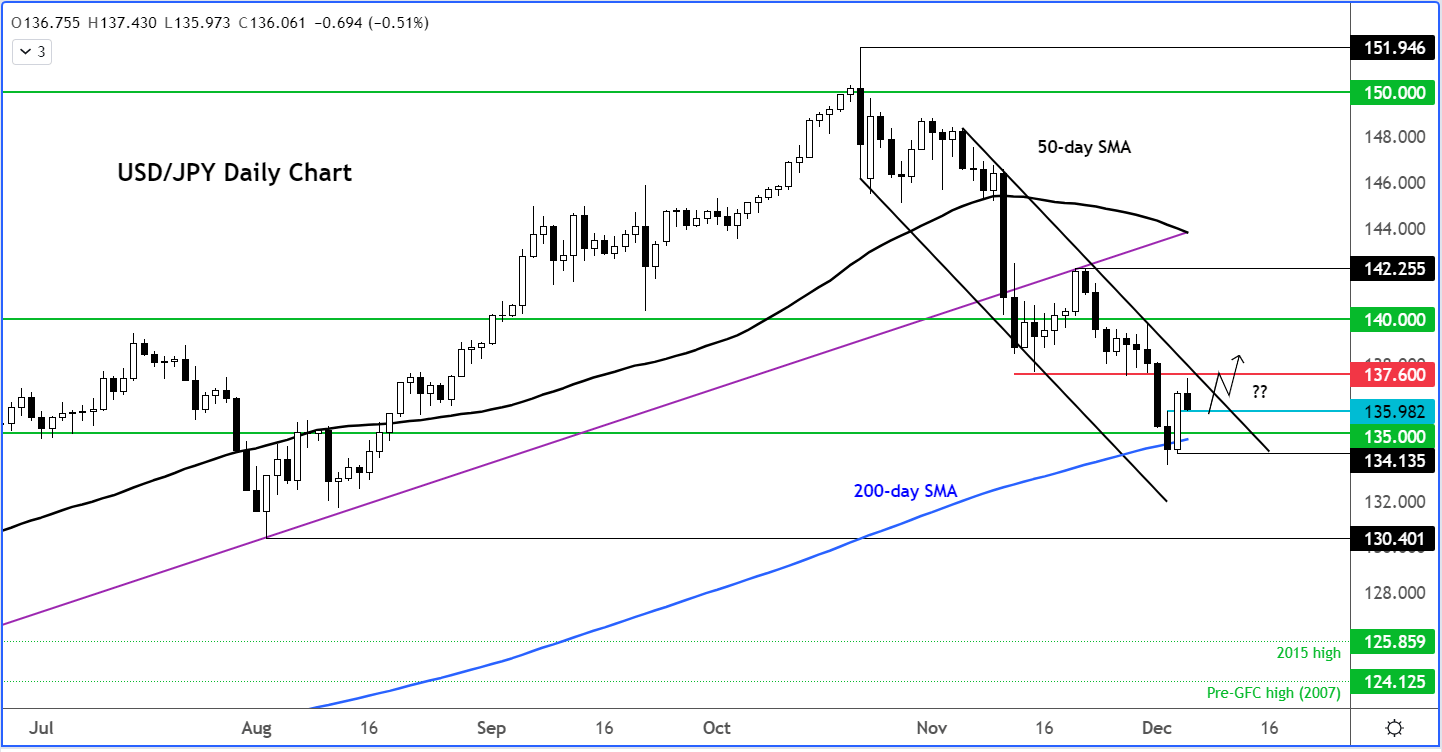 将预期时间框架稍微拉长,在美元/日元成功坚守134.50附近的200天移动平均线后,需要在下跌通道附近形成突破点,吸引更多看涨者回归并做多货币对。