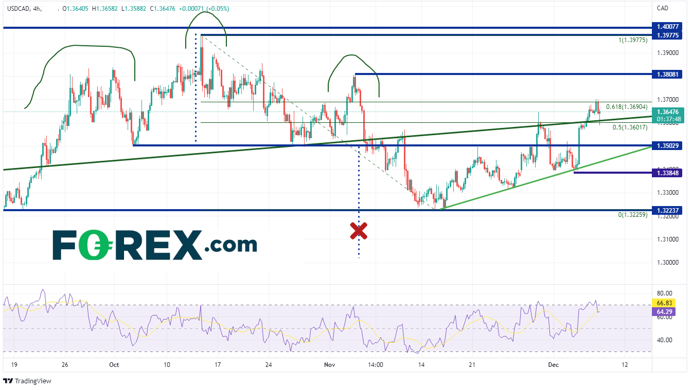 在日线图上,美元/加元在4月5日创下年初至今的低点1.2403。该货币对随后大幅走高并在9月21日突破上升趋势线(绿色),逼近1.3415,最终在10月13日创下年初至今的高点1.3978。美元/加元随后在高位形成头肩形,于11月4日突破颈线1.3503附近。该货币对在向头肩目标位1.3038移动的过程中开始走低,但在1.3224附近的水平支撑位止跌。美元/加元重新走高回到颈线上方,令头肩形失效并形成上升楔形。市场本来预计价格将跌破上升楔形,然而,在12月6日,该货币对收于图形的顶部趋势线上方。但是随着加拿大央行发布公告后,它在今天走低,这会形成假突破吗?