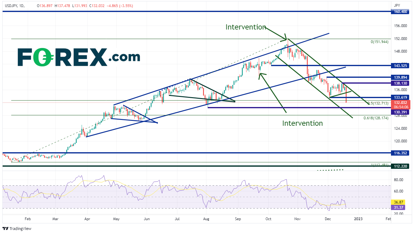 经济学家和市场原本预期,日本央行会向过去一样保持其长期货币政策不变,然而周二举行的12月议息会议打破幻想。日本央行放宽10年期国债收益率的交易区间,从而调整收益率曲线控制(YCC),这一举措令市场措手不及。目前10年期国债收益率波动区间为+/-0.50%,较此前的+/-0.25%大大拓宽。尽管日本央行行长黑田东彦否认这是量化紧缩,但市场将其视量化紧缩 “开始”的号角。 正如在本周明星货币对中提到的,日本央行上周已释放信号,可能在未来数月重新审视其货币政策。就在昨天,日本首相岸田文雄表示,政府计划修改已坚持十年的联合声明,其中承诺日本央行将尽早实现2%的通胀目标。不过据悉,修改联合声明要在日本央行现任行长黑田东彦任期结束后再进行。黑田东彦将于明年4月8日卸任,交易员将密切关注未来几个月的市场反应。