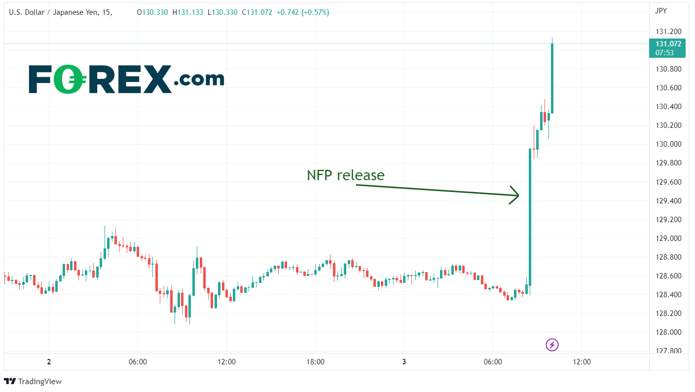 美元/日元在强劲的就业报告和ISM非制造业PMI报告接连发布后从低点跳涨300点。