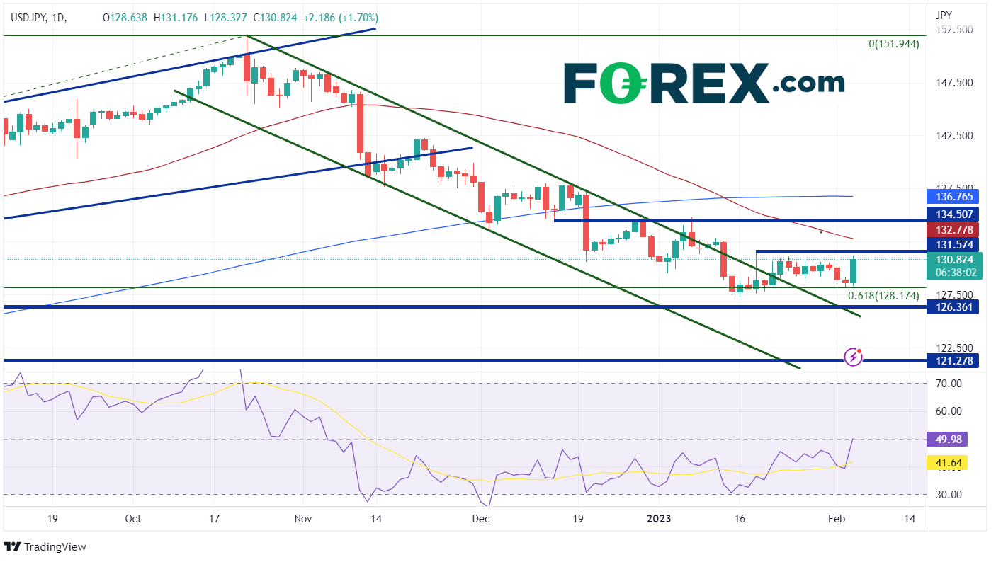 在日线图上,美元/日元自2022年10月创下20年高点151.95以来,一直在通道稳步走低。最近,该货币对停在了从2022年低点到2022年高点区间的61.8%斐波那契回撤位128.17附近。自1月18日以来,美元/日元交投于通道外的127.22至131.57的横向区间。尽管该货币对今天大幅波动,但仍位于该区间内。