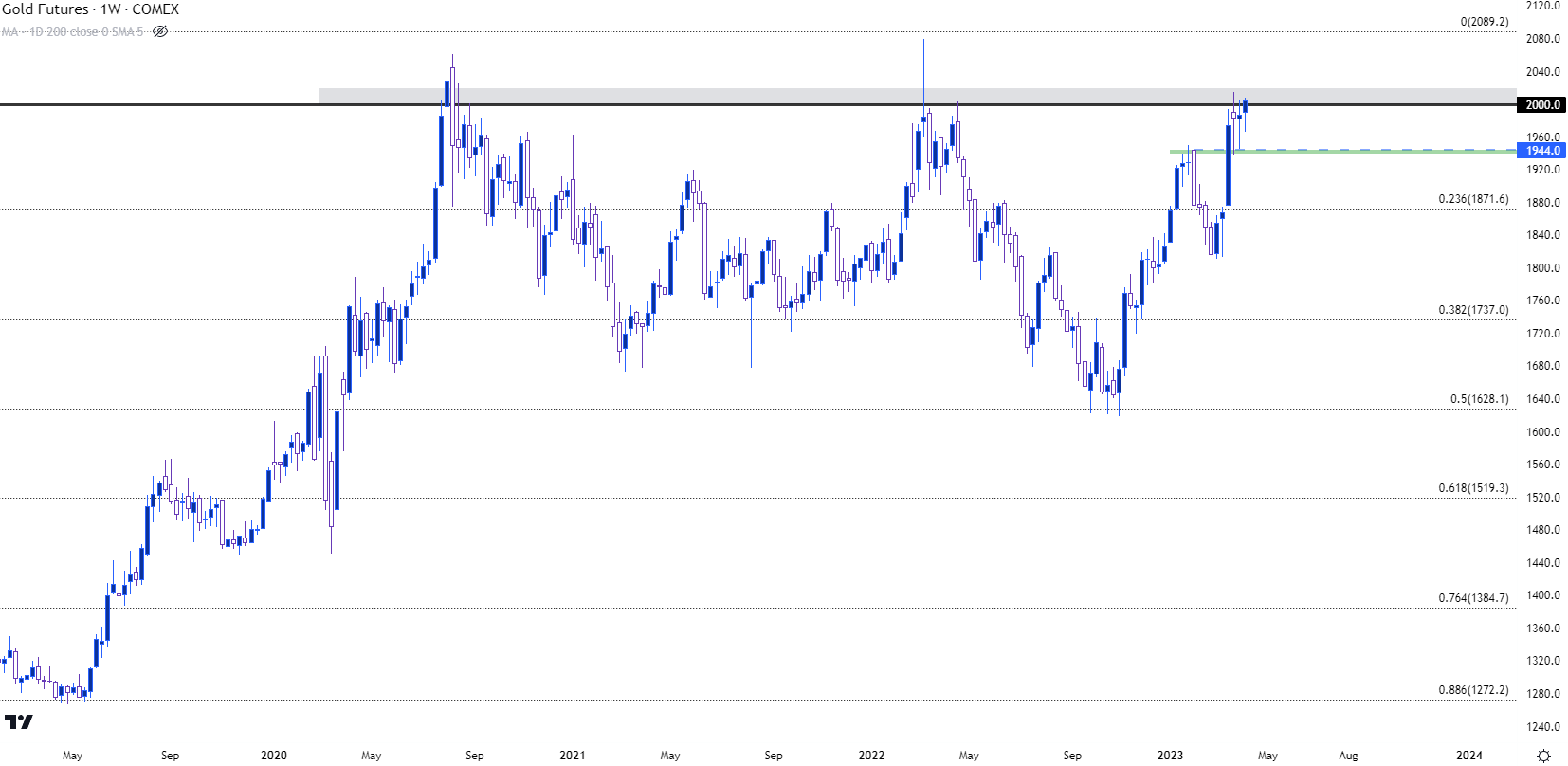 回到黄金周线图上,标出了在2k附近的阻力位。过去两次上破2k的测试都导致了至少400美元的回调。最近一次测试后,价格在2018-2020年主要走势的50%斐波那契回撤位才获得支撑。