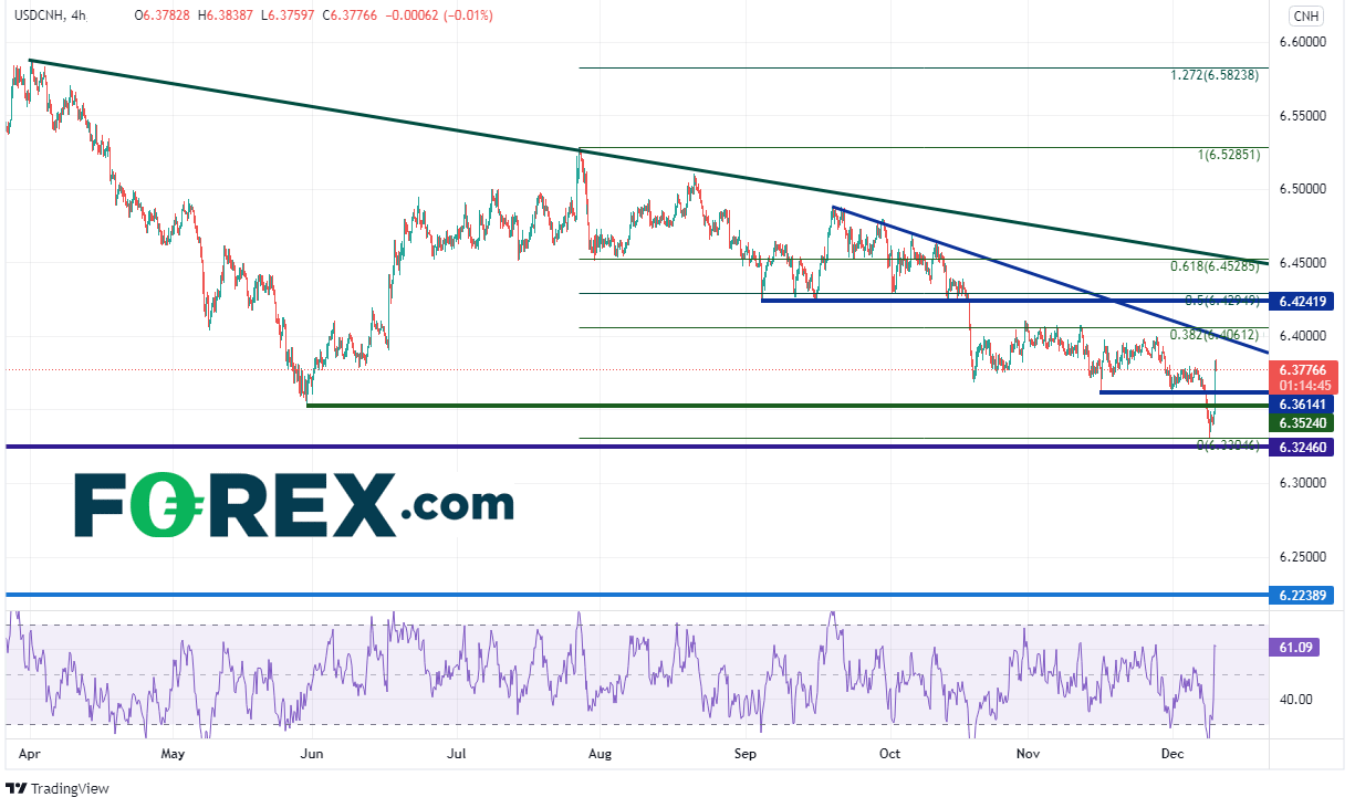包括下降趋势线、50天均线、7月27日高点到12月8日低点行情的38.2%回档位在内的多个阻力相汇于6.400/6.406附近,美元/离岸人民币4小时图可能在该区域遇阻。如果攻克,上档有水平阻力位兼50%回档位所在的6.4242/6.4295一线。支撑位在周三低点6.3304,然后是2018年4月以来水平支撑位,即6.3246。