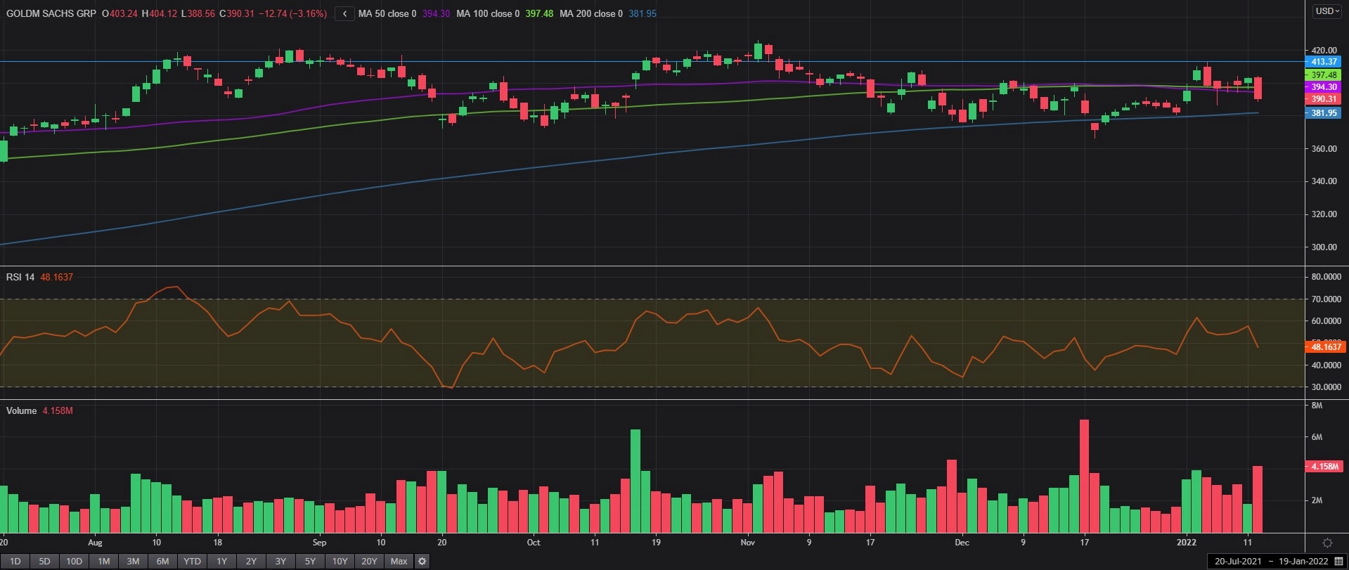 高盛股价在第四季度业绩公布前一直处于盘整模式,此次财报发布或触发股价展开突破。一系列积极业绩和/或前景有望将该股推至今年迄今高位 412.66美元,若拿下,将为攻向11月初触及的426.79美元历史高位开路。