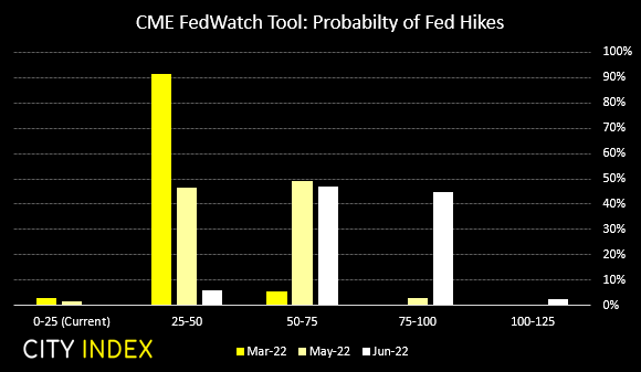 交易员们正忙不迭地抛售债券这个烫手山芋,收益率随之推高。考虑到收益率飙涨的速度和高度,我们曾怀疑他们是否押注了美联储会在3月会议加息50个基点。但市场定价却并非如此。联邦基金期货显示3月加息25个基点的概率略高于90%,加息50个基点概率仅略高于5%。即使到5月,第二次加息概率也仅为50%不到一点。但6月会议前,利率有45%的可能性处于75-100目标区间内,因此,虽然尚未完全明朗,或是全部加息不在单次会议上完成,未来某些时候仍埋伏了数次加息可能性。