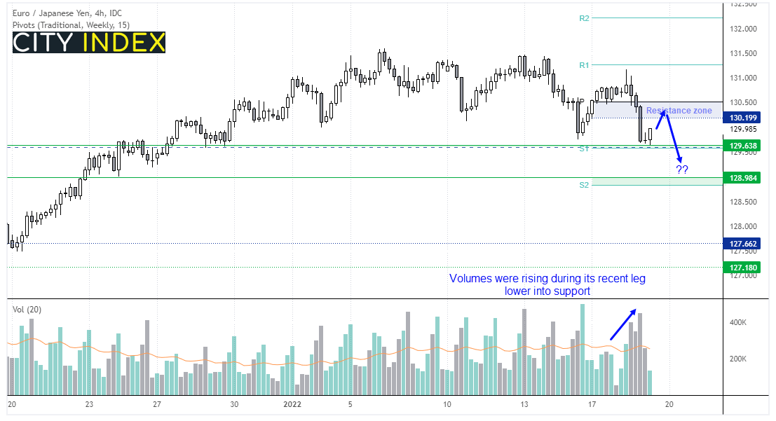 观察4小时图,我们会发现,随着价格跌至关键支撑位,成交量在攀升。不过129.64(200天均线附近)也是周图一号支撑枢纽位置。目前价格正在回撤,但我在周图枢纽130.50附近继续看跌,后市或最终下穿129.50,然后聚焦128.90附近支撑区域。