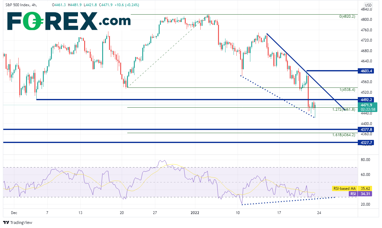 在以上种种不利因素综合作用下,标普500指数出现疫情爆发以来最大日内跌幅。但该股指的大幅下跌行情肇始于数周前,即在1月4日创下历史新高之后。标普500指数击穿了2021年10月1日低点到2022年1月4日高点行情的61.8%回档位,即4481.5附近,攻克了200天均线4439.9,目前报在水平支撑位4431.8附近,相较那些历史高点下跌8%。对这些价位的迅速击破会带来反弹空间吗?日图下个支撑在4377附近。请注意,RSI处于30下方的超卖区域,表明股指或准备反击。