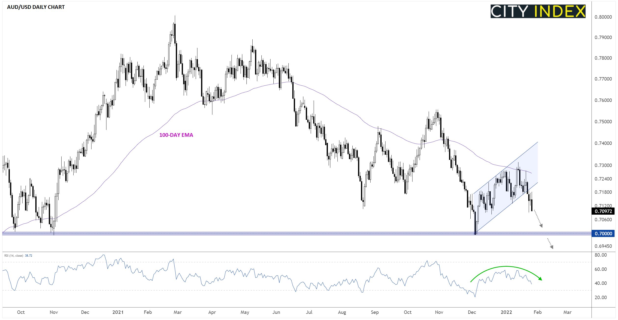 FOMC会后的澳元/美元走势尤其有趣,货币对延续此前看跌旗形跌势。展望后市,澳元/美元阻力最小的路径仍为下行,在下周即将到来之际,关键支撑位18个月低点0.7000进入我们的视野。如果跌破该关键水平,货币对或面临更大跌势,下探0.6900,或0.6800下方疫情后反弹行情之50%回档。