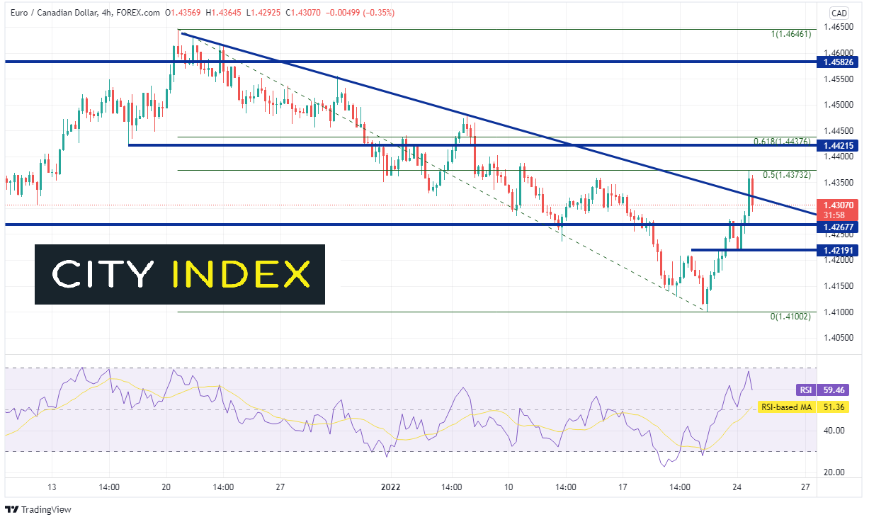 欧元/加元整个2021年秋季持续推低,自1.5098高点探入1.4176低点。随后,货币对2021年12月20日反弹至2021年9月20日高点至2021年11月25日走势之50%回档1.4638附近。自那以来,欧元/加元持续下探,并在上周四创下1.4100新低,这是自2017年4月以来最低水平。