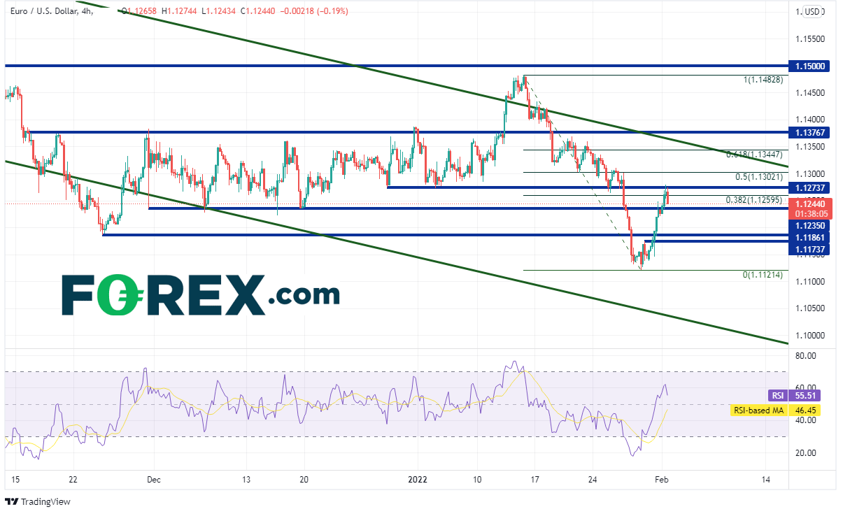 欧元/美元从2021年5月以来一直处于下降通道中,一度于11月底下破此通道,之后横盘回到通道内,只在2022年1月中旬向上测试。2021年12月到2022年1月期间的横盘区间基本落在1.1235 - 1.1375(请看下图绿色线)。该货币对于1月27日下破前述通道与11月24日低点1.1186,但于1月28日形成十字星、1月31日构筑长阳线,早晨之星形态成形,暗示后市向上反转。