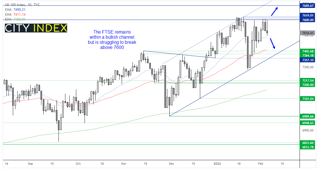 富时指数是另一个很难确定短线走向的全球股指。一方面,该指数仍处于看涨通道内,并已回升看向7600。另一方面,它又很难升穿7600,周五构筑潜在看跌锤子线,若下破低点则确认形态。我们目前持中性观点,若下穿20天均线和7500关口,转向看跌,若上破7620,重回看涨。
