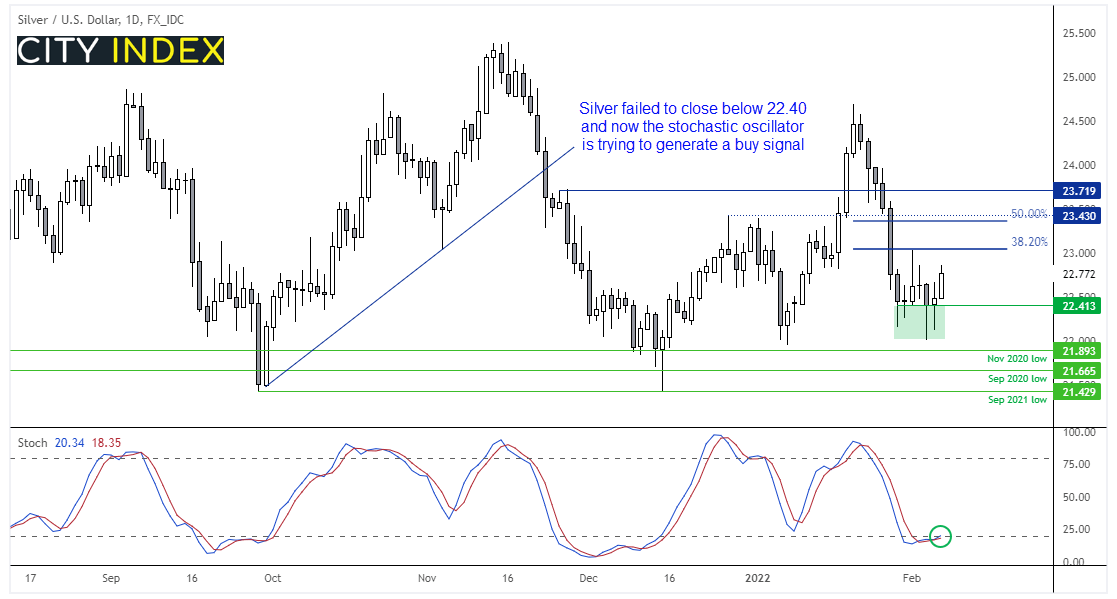 银价自1月高点下跌后,短短10天内急挫逾10%。此后,白银一直处在一个震荡的横盘区间内部,但我们注意到,银价日线图未能收于22.40之下,隔夜交投突破周五十字线高点。这也意味着随机震荡指标试图发出买入信号,但需要等到收盘才能得到确认。不过,银价似乎正在展开反趋势反弹,能否重回23美元成为焦点,此处接近锤子线高点以及38.2%回档。此后,我们或在38.2%/50%回档附近寻求看跌配置,等待动量重回1月高点以来跌势。